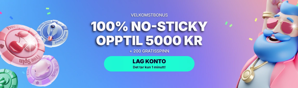 | Velkomstbonus | 100% Non-Sticky opptil 5 000 kr + 200 Gratisspinn |